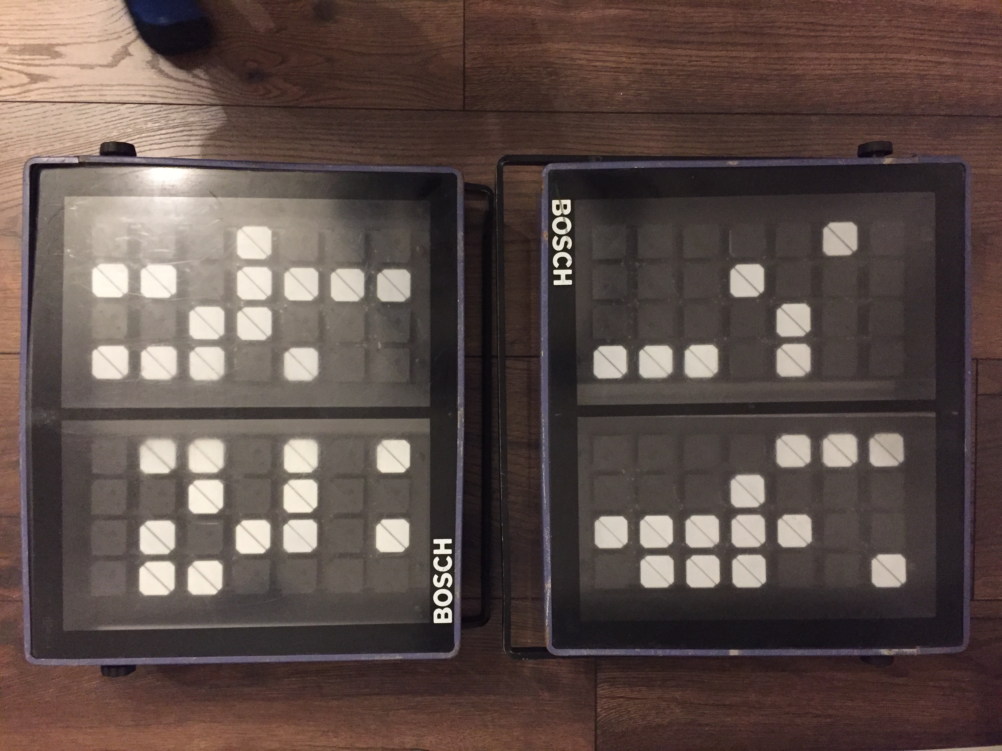 Ursprünglich zur Anzeige des Spielstands auf dem Spielfeld bei Ballspielen gebaut, hat dadurch schön große, rechteckige, weiße Flip-Dots. Zu den Anzeigen gehörte ursprünglich noch ein Koffer mir Steuerrechner und Bedienelementen.